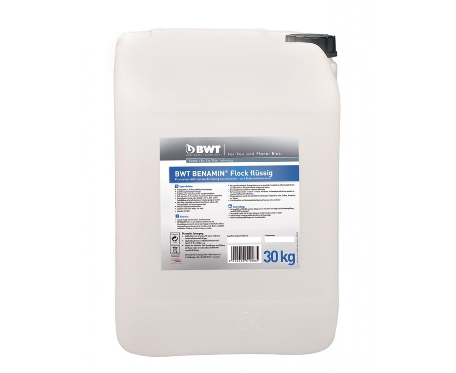 Коагулянт Benamin Flock-flüssing виробництва BWT – флокулюючий засіб високої ефективності, основою якого є поліалюміній гідрохлорид. Застосовується для обробки і очищення води в плавальному басейні від домішок і забруднень за допомогою утворення на водній поверхні пластівців гідрооксидів металів (дрібні частинки колоїдних забруднень, що накопичилися), що осідають з високою швидкістю на дні басейну і швидко вловлюються системою фільтрації (пісочним фільтром). Засіб може застосовуватись для очищення води як у відкритих (вуличних), так і у внутрішніх басейнах. Відсутність у складі препарату важких металів та домішок дозволяє використовувати його як засіб очищення та обробки питної води.