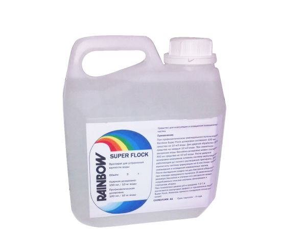 Після ударного дозування коагулянту Rainbow Super Flock (рідкий) залишити систему циркуляції води, що працює приблизно 20 хв. Потім вимкнути систему циркуляції на 6 або більше годин для зв'язування та осадження зважених частинок. Після випадання осаду на дно басейну підключити вакуумний (донний) пилосос до системи фільтрації води та обережно прибрати осад. У процесі прибирання, уважно контролюйте стан води, що повертається до басейну після фільтрації. Залежно від ступеня засмічення води, стану системи фільтрації та об'єму басейну, в процесі прибирання осаду, що утворився, не виключається необхідність періодичного промивання фільтра.
