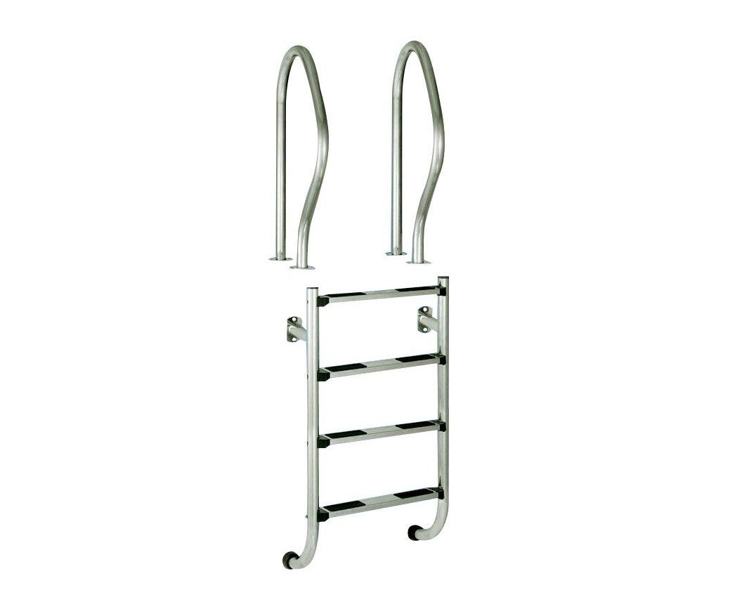 Сходи на 4 сходинки Kripsol серії Two-Part AISI-316 для установки в бетонні басейни, оформлені ПВХ-плівкою або мозаїкою (плиткою). Нержавіюча сталь, з якої виготовлені іспанські сходи, має подвійне полірування, що значно підвищує її антикорозійні властивості. Складається з окремих частин (блок зі сходами та поручні), кріплення яких здійснюється також окремо. У комплекті передбачені елементи кріплення: анкерні болти, круглі декоративні накладки.