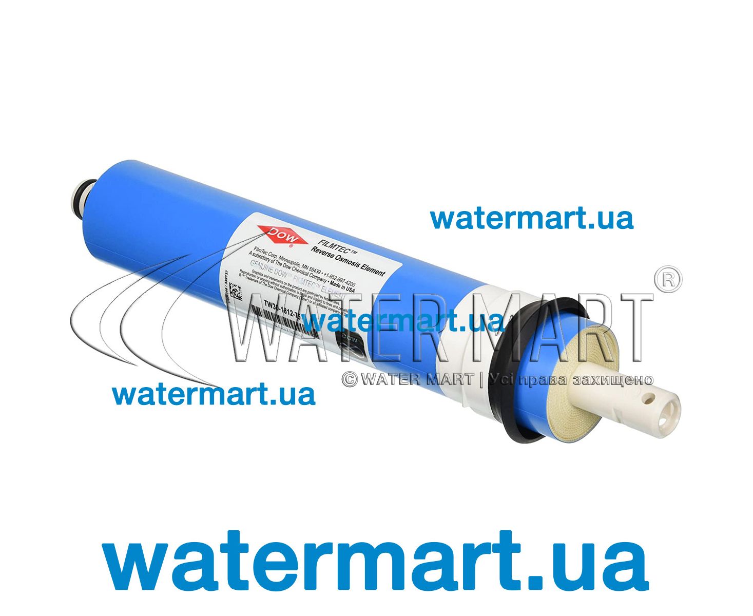 Мембрана Filmtec TW30-1812-75/BW60-1812-75 – змінний мембранний елемент (RO) 75 GPD, що використовується у системах зворотного осмосу для очищення питної води, встановлених у житлових приміщеннях. Мембрани Filmtec являють собою тонкоплівкові композитні мембрани у вигляді конструкції зі спіральним намотуванням. Порівняно з іншими мембранними модулями (трубчасті, пластинчасті, мембрани з порожнистих волокон) спіральні елементи забезпечують нижчі витрати при заміні, легкі в обслуговуванні, мають тривалий термін служби та очищають на 20 % більше води. Мембрана здатна затримувати частинки органічних і неорганічних забруднень розміром більше> 0,001 μm (забезпечує ступінь очищення води до 99 %). Продуктивність – 238 л/добу. Діапазон робочої температури від +4 до +35 °C (max: +45 °C). Тиск: 2,8-8 атмосфер.