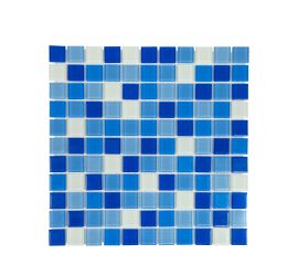 Серія матової скляної мозаїки 20 х 20 х 4 мм Aquaviva Majorca Dark для облицювання басейнів. Колір: синій, світло-синій, блакитний. Основа: папір. Лист: 327 x 327 мм. Упаковка: 20 листів / 2,14 м².