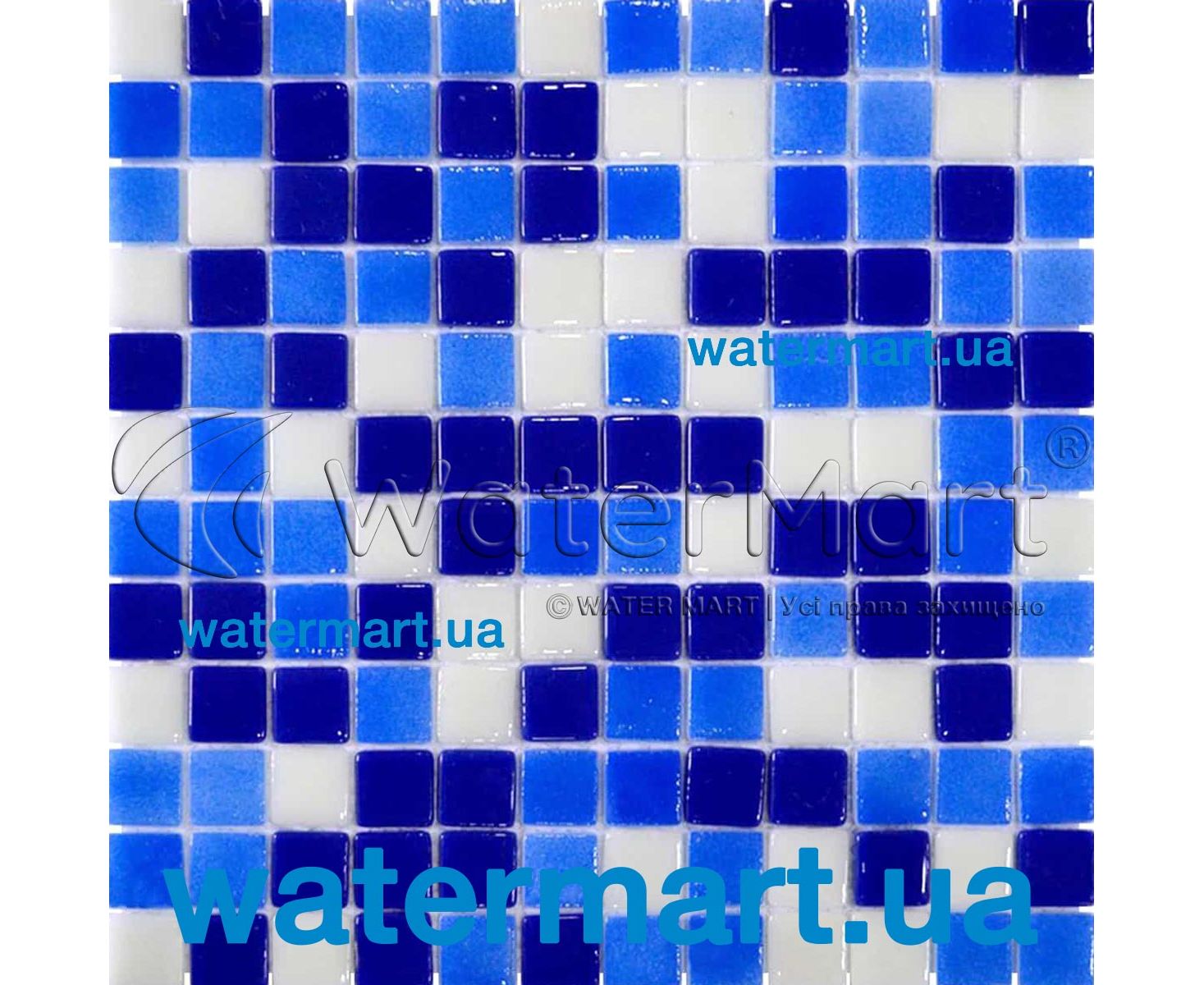 Комплект скляної мозаїки розміром 25 х 25 х 5 мм серії Bagama Dark KL052 для облицювання басейнів. Матовий тон; колір: білий, блакитний, темно-синій. Основа: паперова. В упаковці 22 листи загальною площею мозаїки 2,18 м².