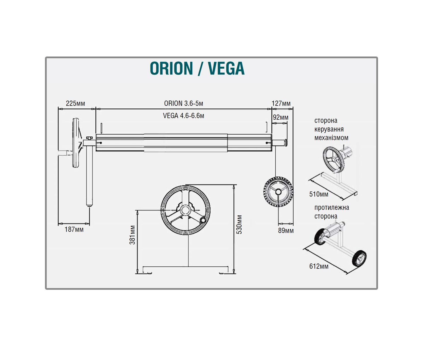 W-ENPT02200 3-4,6 x 11 м | MANUAL REEL SYSTEMS ORION Max | By DEL – міцна ручна система намотування / зберігання теплозберігаючої солярної плівки для плавальних басейнів шириною до 4,6 м і довжиною до 11 м. Призначена для використання як у заглиблених, так і надземних басейнах.