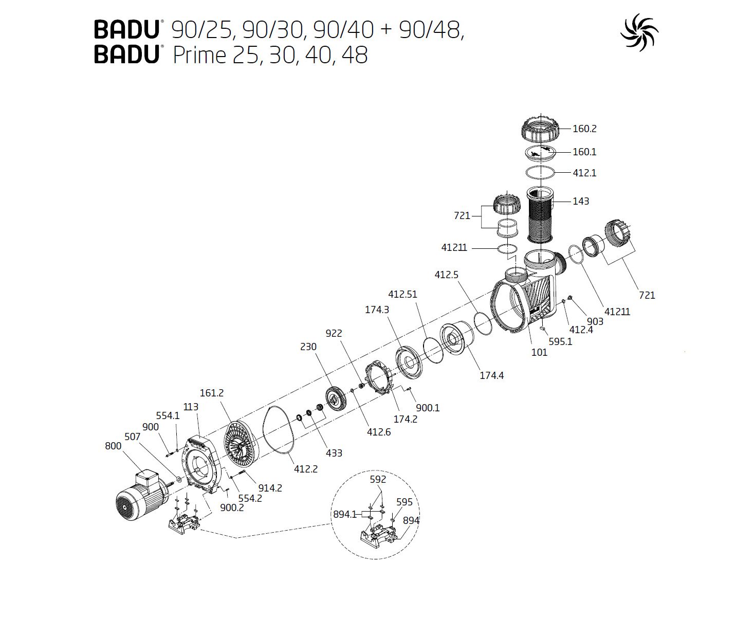 Високопродуктивний самовсмоктуючий циркуляційний насос преміум-класу Badu Prime 25 219.0258.038, що застосовується для систем фільтрації плавальних басейнів приватного або громадського користування з об'ємом води до 100–125 м³. Ця модель є оновленою версією популярного насоса BADU 90/25.