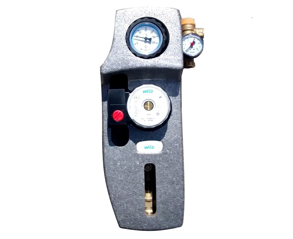 Насосна група для сонячної системи укомплектована циркуляційним насосом Wilo, витратоміром із групою наповнення та зливу системи, групою безпеки (6 бар), зворотним клапаном та термометром для контролю температури теплоносія у контурі опалення.