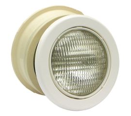 Галогенний прожектор з білою полімерною рамкою та підтримкою LED-ламп для освітлення басейну.