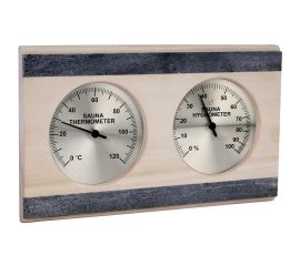 Термогігрометр з двома циферблатами, захищеними термосклом, що вимірює рівень вологості повітря та його температуру в сауні.
