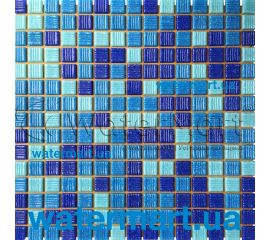 Серія матової скляної мозаїки 20 х 20 х 4 мм Aquaviva Majorca Dark для облицювання басейнів. Колір: синій, світло-синій, блакитний. Основа: папір. Лист: 327 x 327 мм. Упаковка: 20 листів / 2,14 м². Мінімальне замовлення – 1 коробка (20 листів / 2,14 м²).