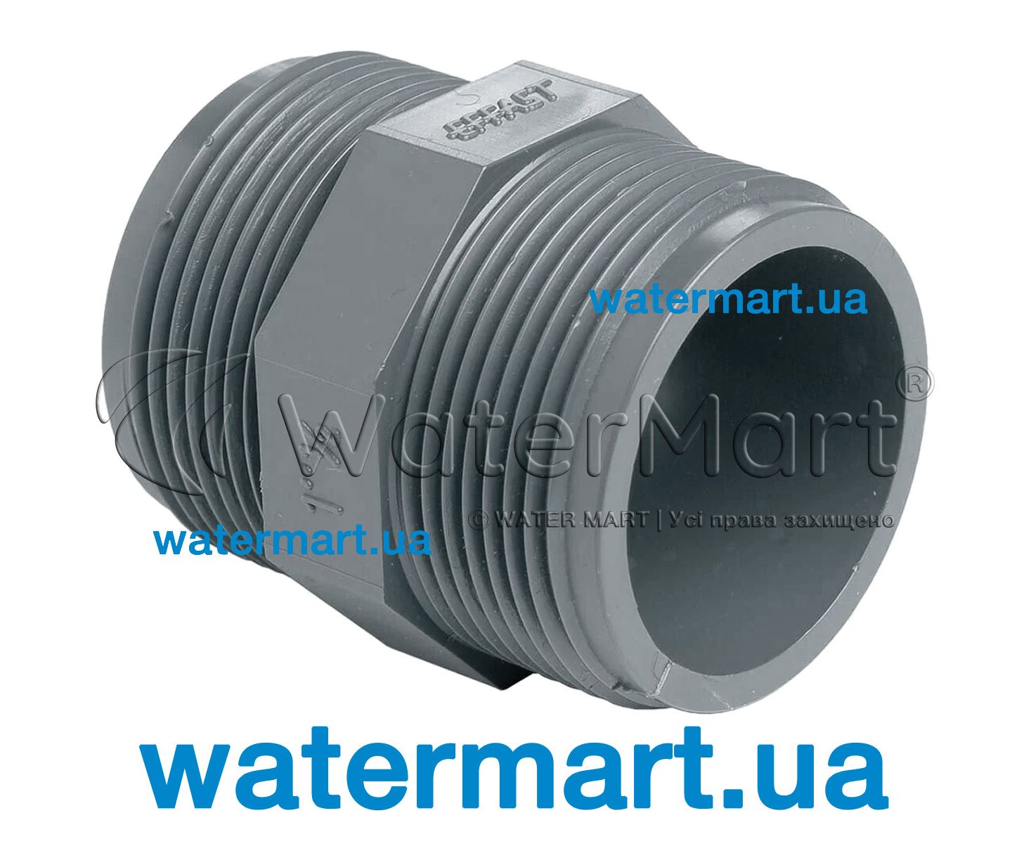 Різьбова редукція / Ніпель перехідний (різьба: 1½") EFFAST PVC-U BSPP threaded fittings | HEXAGON NIPPLE RERNIE050F. Застосовується для транспортування рідин до +60 °C у плавальних басейнах, побутових та промислових системах ПВХ-трубопроводу. Матеріал: PVC-U.