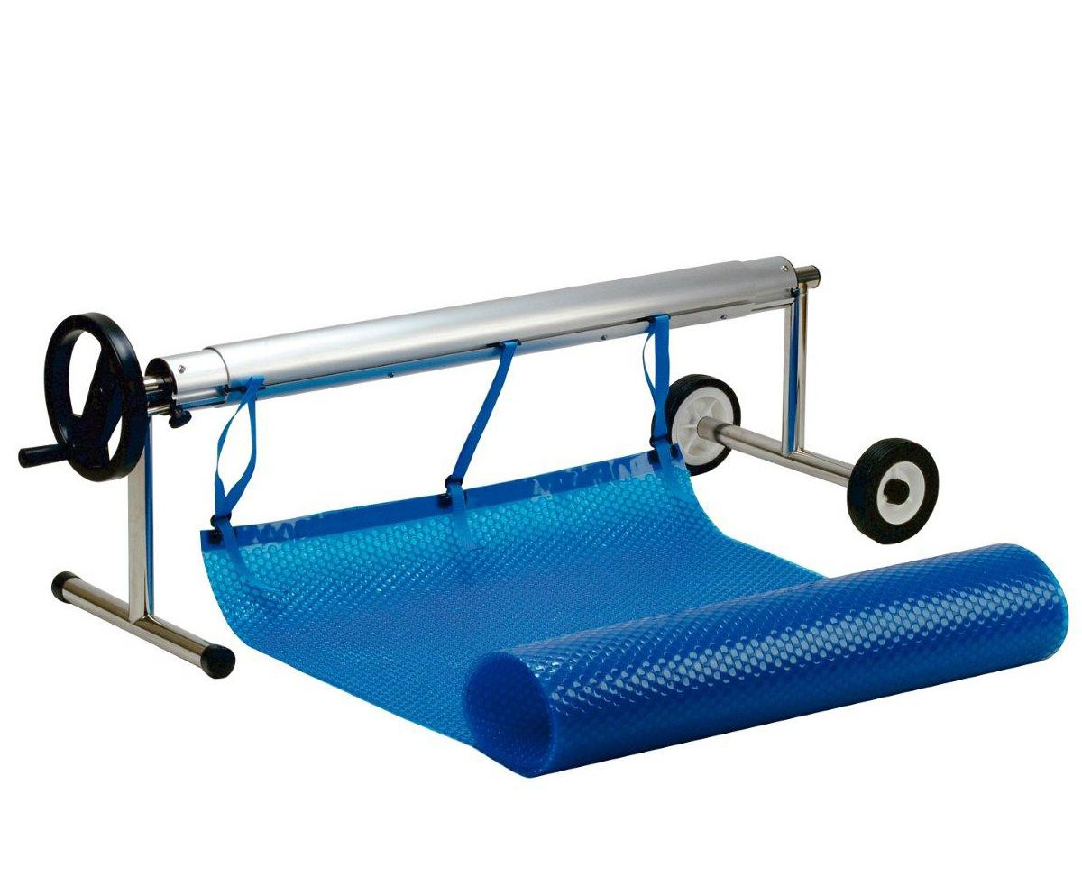 Щоб розстелити солярну (теплоізоляційну) плівку на басейн, необхідно придбати намотувальний пристрій. З його допомогою виконати натяжку може навіть одна людина, а перемістити намотувальний пристрій разом із солярною плівкою від басейну можна за допомогою кількох коліс. Для цього достатньо підняти хрестовину, яка також призначена для забезпечення більшої стійкості валу ролетного під впливом навантаження.