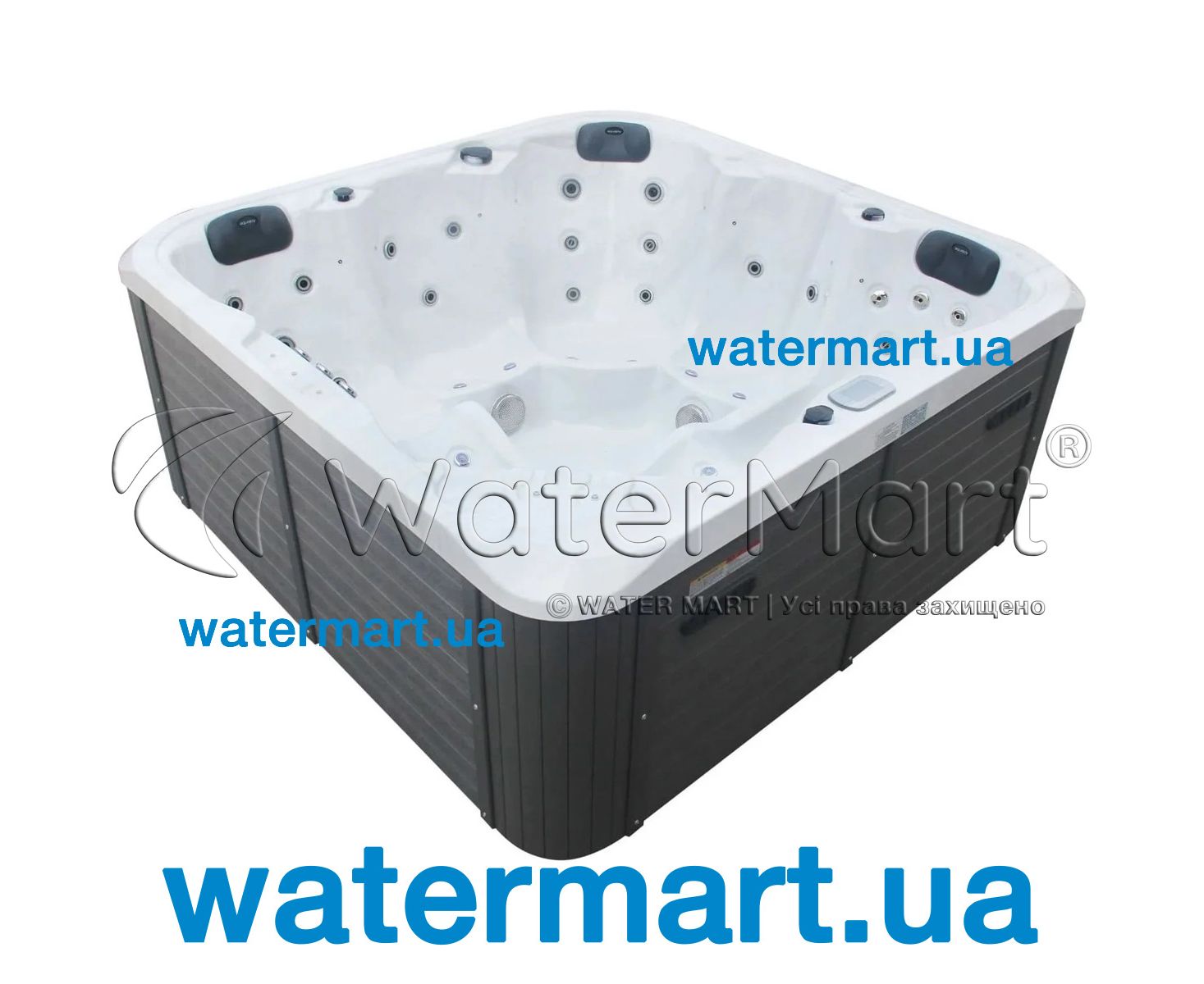 Hydromassage SPA-pool Aquajoy Riviera Silver White Marble | AJ-5814BSWBL. Квадратний гідромасажний СПА-басейн на 5 місць (3 крісла / 2 лежаки) розміром 200 x 200 x 90 см. Панель управління та система контролю: Balboa Systems. Колір чаші: «сріблясто-білий мармур». Об'єм води: 1030 л. Кількість гідромасажних форсунок: 36 шт., аерофорснуки: 12 шт. Чаша: акрил Aristech® Acrylic. LED-підсвічування: 28 ламп.