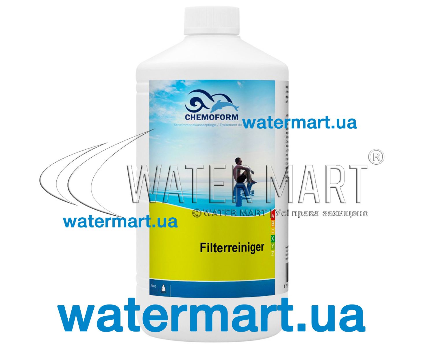 CHEMOFORM Filterreiniger – фільтр-очисник для пісочних, картриджних та кізельгурових фільтрів. Засіб видаляє вапняний наліт, органічні частинки (біоплівки), залишки олії та інші забруднення, що накопичилися у фільтрі. Збільшує потік через фільтр та покращує фільтруючий ефект. Застосування засобу (для очищення пісочних фільтрів): перед початком застосування необхідно вимкнути всі дозуючі пристрої. Потім слід закрити злив на дні басейну і встановити клапан фільтра, що управляє, в режим зворотного промивання «Backwash». Далі при включеній фільтрувальній установці повільно налити в скімер від 200 до 300 мл очищувача. Залишити фільтр-установку увімкненою не менше 5 хвилин, поки вода не стане чистою. Потім слід встановити фільтр у режим ополіскування "Rinse" приблизно на 10-15 секунд, переключити фільтр у звичайний режим фільтрації "Filter", і включити інше обладнання. Зберігати препарат необхідно щільно закритим у приміщенні, що добре вентилюється, при кімнатній температурі. Термін зберігання – 2 роки.
