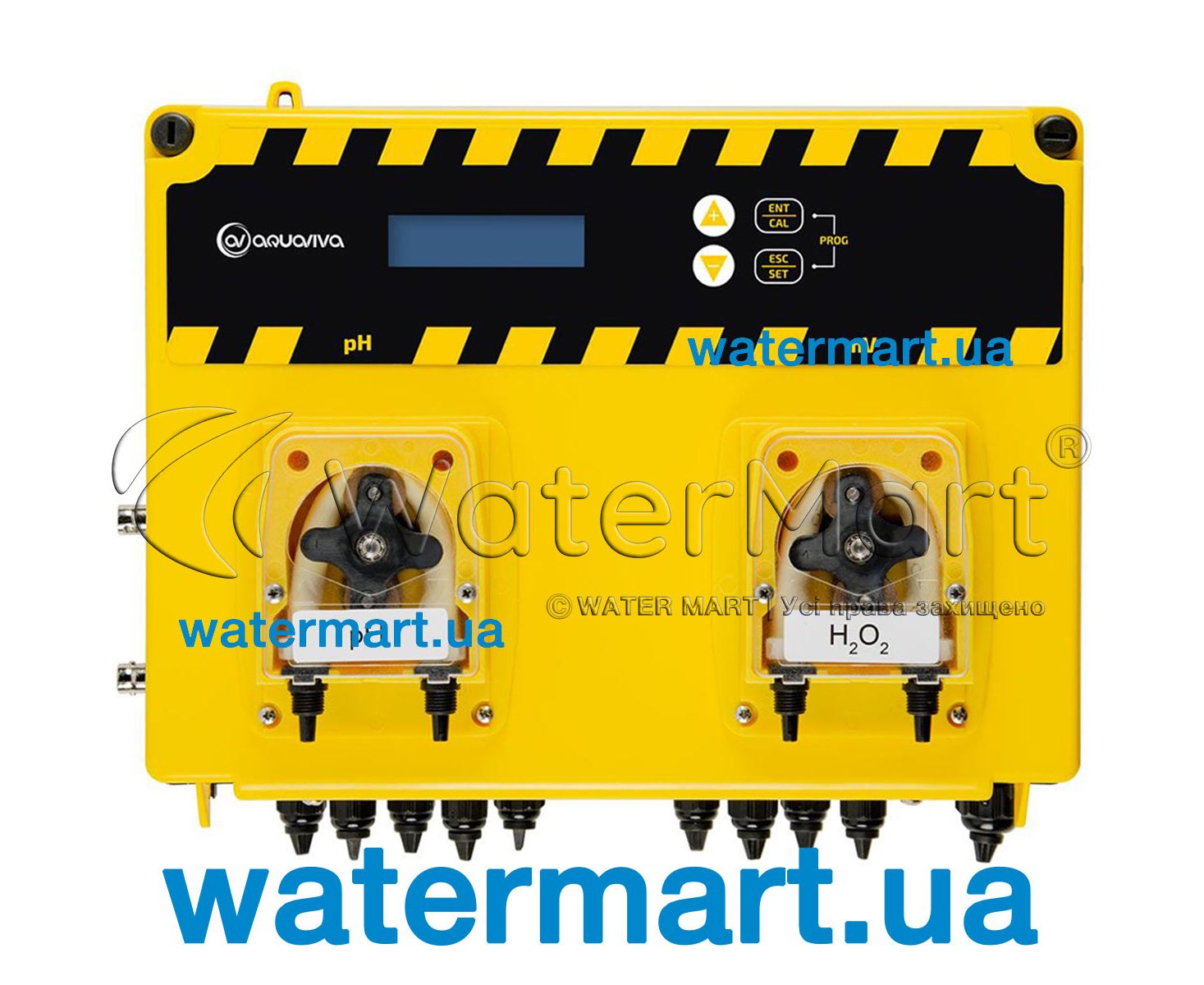 Автоматична система дозуючих перистальтичних насосів Aquaviva pH / H₂O₂ в комплекті з датчиком температури та калібрувальними розчинами. Використовується для регулювання та подачі хімічних реагентів у басейнах об'ємом до 250 м³. Продуктивність: 1,5 л/год.