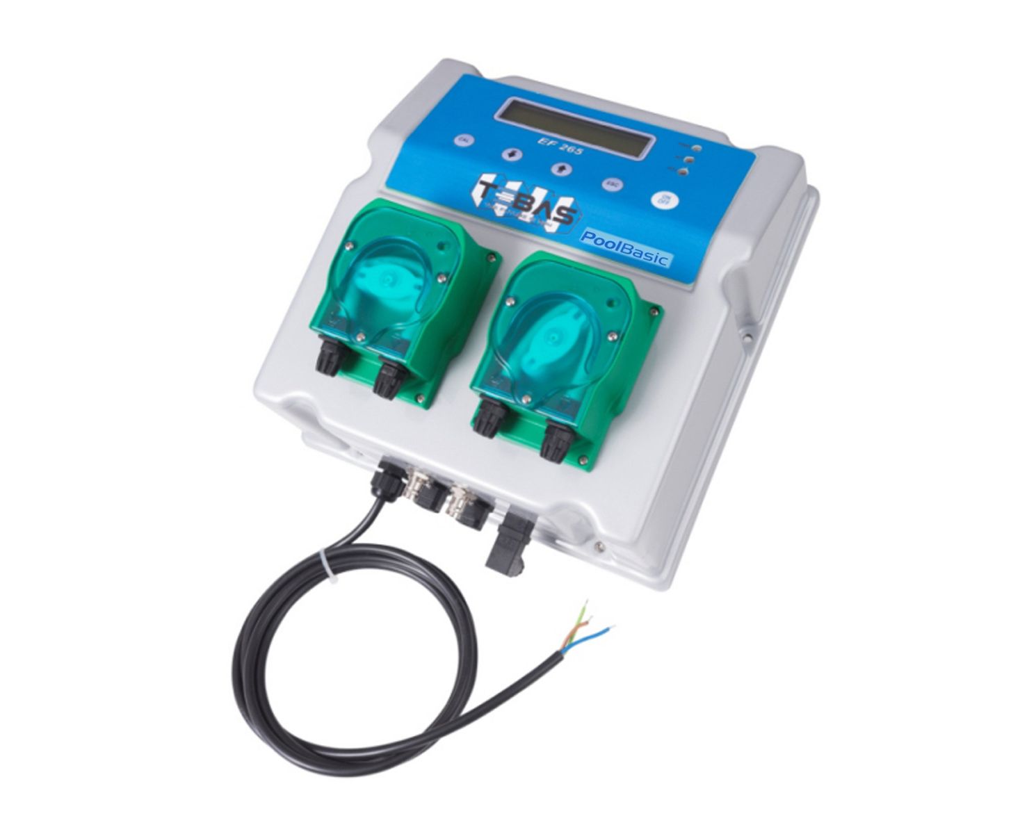 Автоматична станція Tebas Poolbasic для вимірювання та подальшого пропорційного дозування препаратів, що містять хлор та кислотно-лужні реагенти. Встановлюється як дезінфекційне обладнання плавальні басейни приватного або комерційного користування. Установка призначена для вимірювання та корекції показників pH та кисню (Ox) у воді басейну. Оснащена цифровим дисплеєм та сенсорними кнопками для налаштування та зчитування оброблених даних.