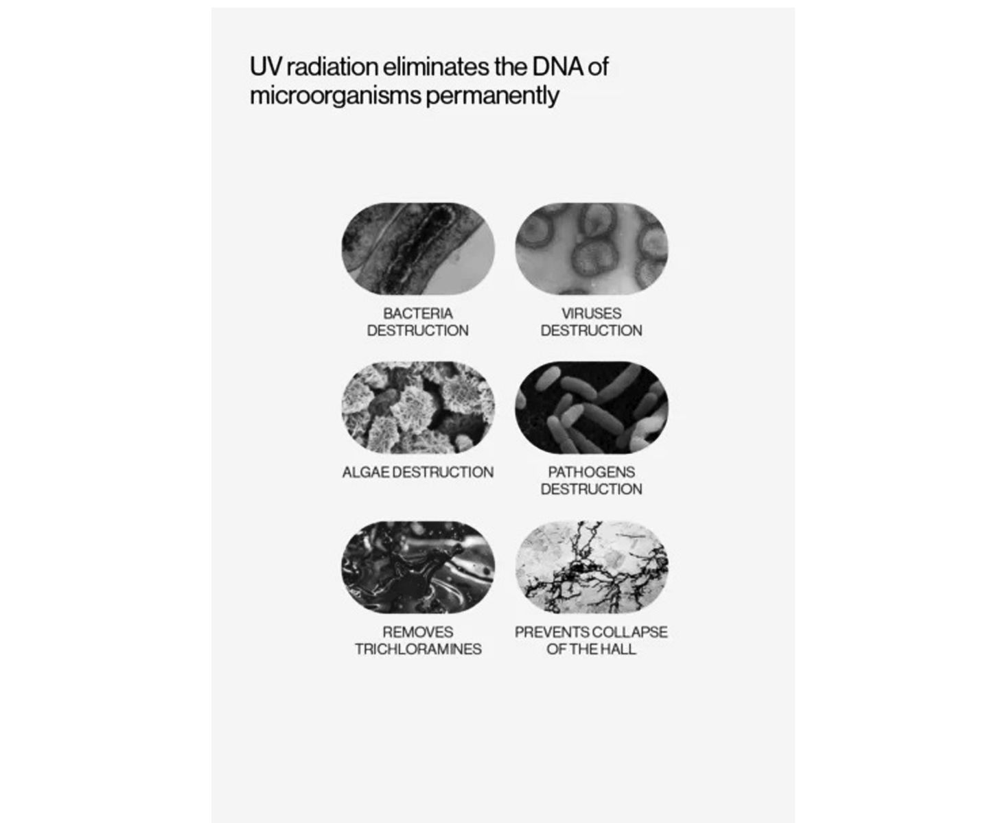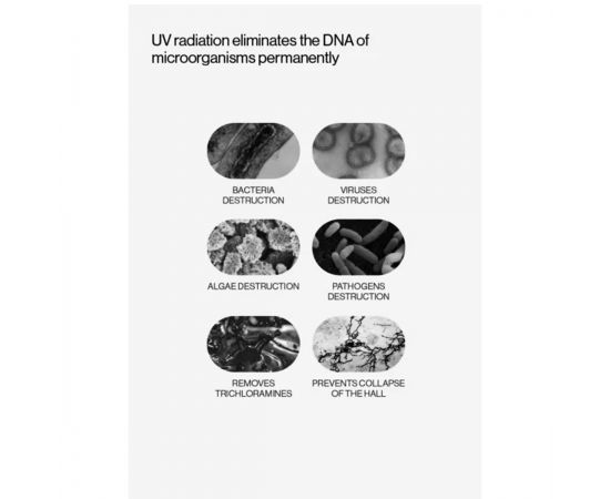 - Удаляет хлорамины, вирусы, бактерии и другие вредные микроорганизмы в воде бассейна