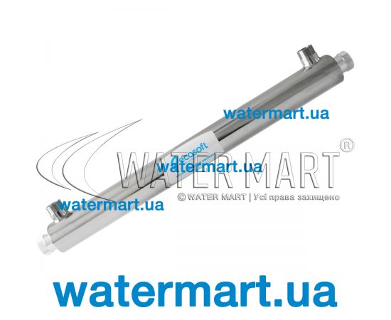 Ecosoft E-480 – ультрафиолетовая бактерицидная лампа мощностью 29 Вт в нержавеющем металлическом корпусе, применяющаяся для дезинфекции питьевой воды и воды промышленно-коммерческого назначения (квартиры, частные дома, отели, рестораны и пр.). Номинальный срок службы – до 9 тыс. часов. Состоит из металлического корпуса (нержавеющая сталь марки AISI-304L), ультрафиолетового излучателя T529 и кварцевого кожуха. В комплект поставки входит электронный балласт 220 В. Применение UV-лампы в качестве основного обеззараживающего оборудования в системе водоочистки позволяет максимально эффективно производить очистку питьевой воды, не применяя при этом дополнительных средств и устройств. Мощность излучения – 30 мДж/см². Подключение к трубопроводу – резьбовое соединение 1". Давление на входе (max) – 8 атмосфер. Производительность – 1,81 м³/ч.